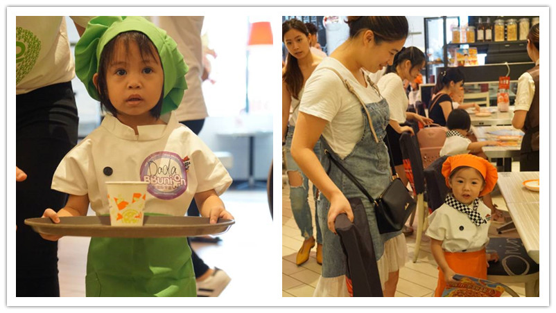 当然,我们也要给小盆友体验一下当服务员的乐趣。首先,妈妈充当为一名客人,小小服务员需要把客人带上座位上,并且为客人倒水,最后为客人模拟点餐下单。